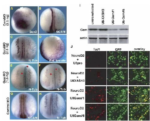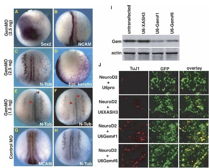 igure 6. Loss of Gem activity results in premature neurogenesis. (A) Xenopus embryos were injected with 2.5 ng (A) or 1.5 ng (E,F) of GemMO or 20 ng of control MO (G,H) and probed as indicated (white). Red arrowheads in E and F mark the pos- terior end of N-tubulin expression in the medial stripe on each side of the embryo. (I) Reduction of Gem protein level in P19 cells by RNAi. (J) Reduction of Gem sensi- tized P19 cells to differentiate into neurons at a subthreshold level (50 ng) of NeuroD2. P19 cells were transfected as indicated and probed with TuJ1 antibody to detect neu- rons. GFP expression plasmid was cotrans- fected to trace transfected cells.