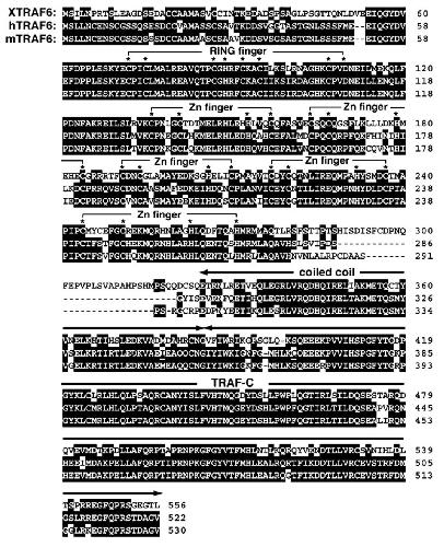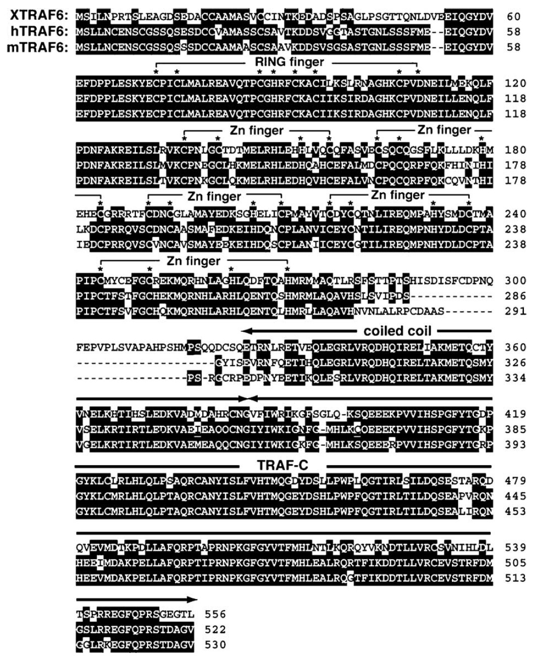 Fig. 1. Comparison of the amino acid sequences of X. laevis, mouse, and human TRAF6s. The RING finger, Zn finger, coiled-coil and TRAF-C domains are