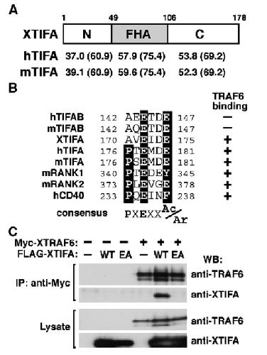 Tumor necrosis factor receptor (TNFR)-associated factor 6 (TRAF6) transduces signals from members of the TNFR superfamily and the Toll/IL-1R family, leading to activation of transcription factors such as NFkappaB and AP-1. Genetic disruption of the TRAF6 gene in mice results in various developmental abnormalities during embryogenesis, including osteopetrosis, failure of neural tube closure, defective formation of skin appendices, absence of lymph nodes, and absence of mature thymic epithelial cells. To clarify the effect of TRAF6 in development, we previously identified a TRAF-interacting protein with a forkhead-associated domain (TIFA), which binds and activates TRAF6 upon extracellular stimulation. To understand the physiological roles of TRAF6 and TIFA in early development, we studied these genes in Xenopus laevis. Here, we describe identification of X. laevis homologs of mammalian TRAF6 (XTRAF6) and TIFA (XTIFA). As was the case for the mammalian homologs, overexpression of XTRAF6 or XTIFA activated NFkappaB, whereas XTIFA carrying a mutation that abolishes XTRAF6 binding failed to activate NFkappaB, suggesting that XTIFA activates NFkappaB by binding to XTRAF6. XTIFA and XTRAF6 mRNAs were expressed at similar levels in zygotes from the neurula stage and then increased. Whole-mount in situ hybridization revealed that XTRAF6 mRNA was expressed in the head region and neural tube during the neurula stage, and the expression expanded to the pharyngeal apparatus during the tailbud stage. This localization is consistent with the defective neural tube closure and abnormal thymus organogenesis observed in TRAF6-deficient mice. Our results suggest possible cooperation between XTRAF6 and XTIFA during embryogenesis.