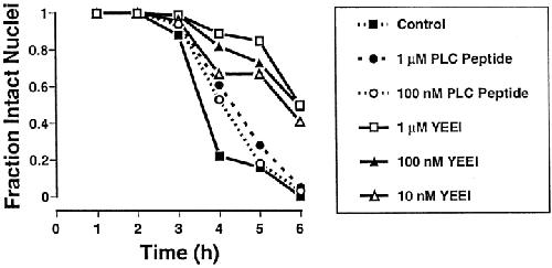 Figure A1. Comparison of SH2 ligand peptides with regard to their effects on the Xenopus cell-free apoptosis system. The experiment was done as in Fig. 4, except that either the YEEI peptide, or a synthetic peptide corresponding to the SH2 ligand domain of phospholipase C (PLC)-γ1 surrounding Y1021 (PLC peptide, DNDY*IIPLPDPK; 35) was added to the system at the indicated concentrations before incubation. Note that the PLC-γ1 peptide had no significant inhibitory activity in this system.