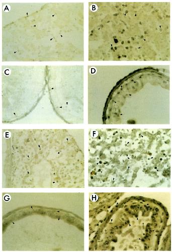 immunocytochemical localization of xTRB; (b,d,f,h) histochemical staining. Arrowheads indicate spatially restricted dense pockets of