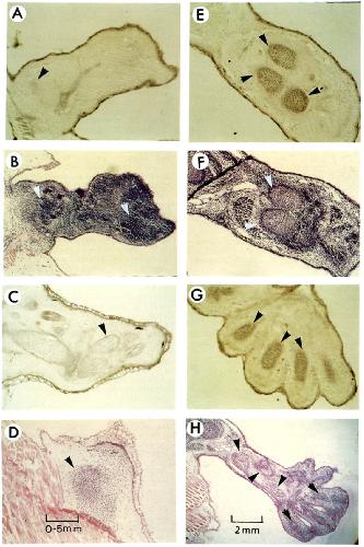 cells particularly enriched in xTRB. Note that the limb-bud in (d) is sectioned through a different plane from that of other sections, also