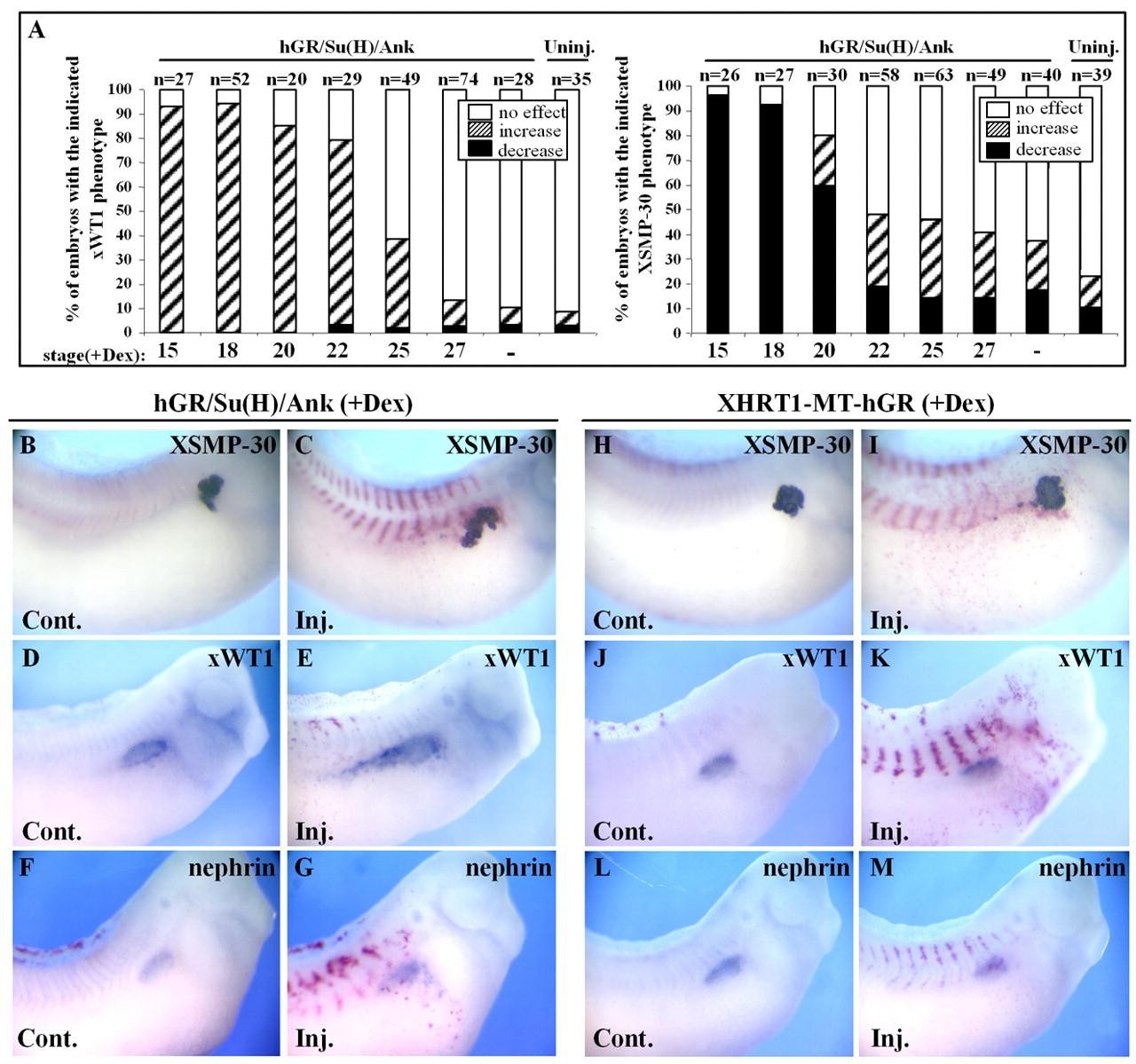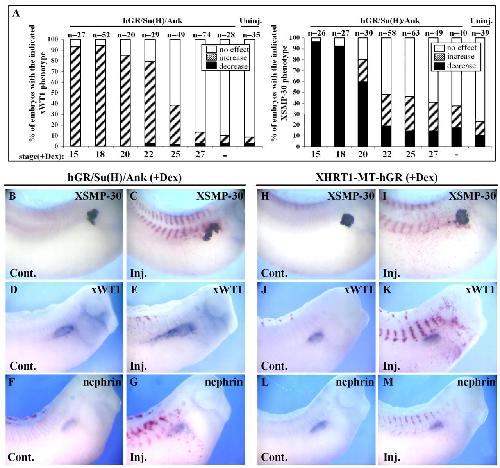 Fig. 6. Comparison of the ability of hGR/Su(H)/Ank and XHRT1-MT-hGR to affect the expression of proximal tubule and glomus markers. (A) Activation of Notch signaling until stage 25 expands xWT1 efficiently, while later activation had no effect. XSMP-30 expression was increased in some embryos activated between stages 22 and 27. Embryos were co-injected with hGR/Su(H)/Ank andβ -galactosidase mRNA. Injected embryos were treated, or not, with Dex at the indicated times and analysed at stage 32-35. Changes in the expression of xWT1 and XSMP-30 at each stage were scored in individual embryos by comparing the injected and injected sides in at least two different injections. Embryos were classified into three phenotypes (no changes, increase or decrease). n, number of cases analysed. (B-M) Control and injected sides of embryos injected with the indicated mRNA together with β-galactosidase mRNA, treated with Dex at stage 18 (xWT1, nephrin) or 25 (XSMP-30) and analysed with the indicated probes. Note that hGR/Su(H)/Ank expands xWT1, nephrin and, in a few cases, XSMP-30, while XHRT1-MT-hGR has no effect.