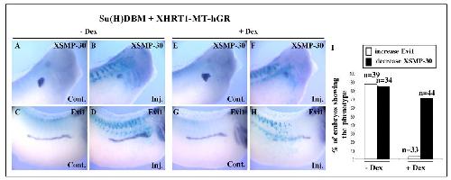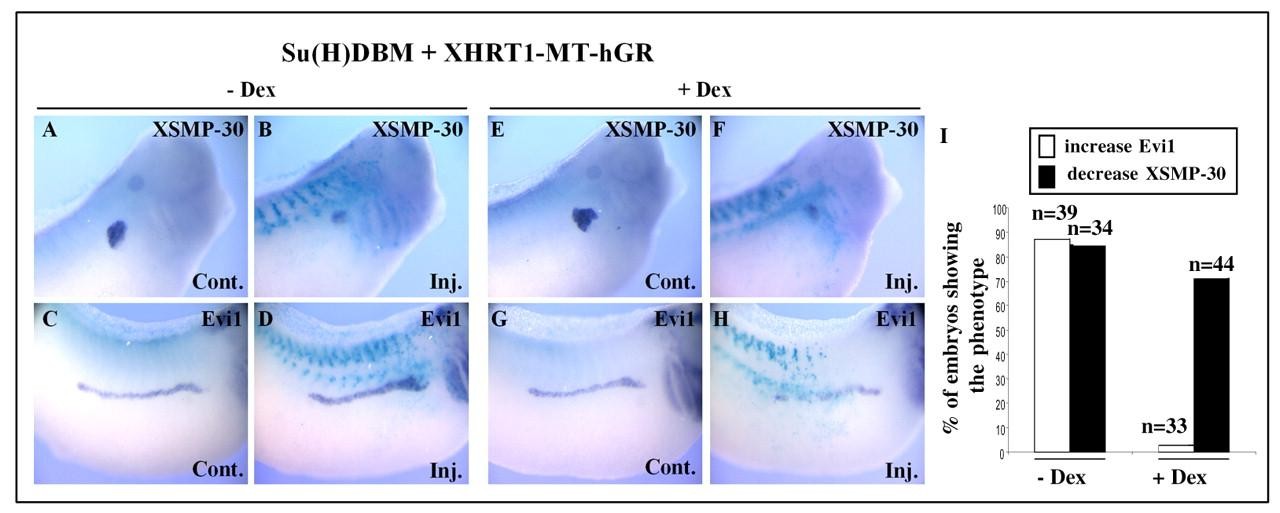 Fig. 7. XHRT1 reverses the effect of Su(H)DBM on Evi1 but is not sufficient to restore XSMP-30 expression. (A-H) Late tailbud/early tadpole stage embryos injected with 500 pg of Su(H)DBM mRNA together with 500 pg of XHRT1a-mut-MT-hGR mRNA, untreated (A-D) or dexamethasone treated (E-H) at stage 22.β -galactosidase RNA was co-injected to identify the injected side. Note the decrease of XSMP-30 and the increase of Evi1 expression in untreated embryos, and the reduction of both XSMP-30 and Evi1 expression in treated embryos. (I) Quantification of the results. Embryos were classified into two phenotypes (increase Evi1 and decrease XSMP-30). n, number of cases analysed.