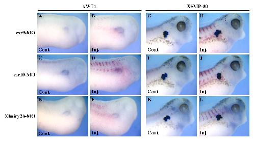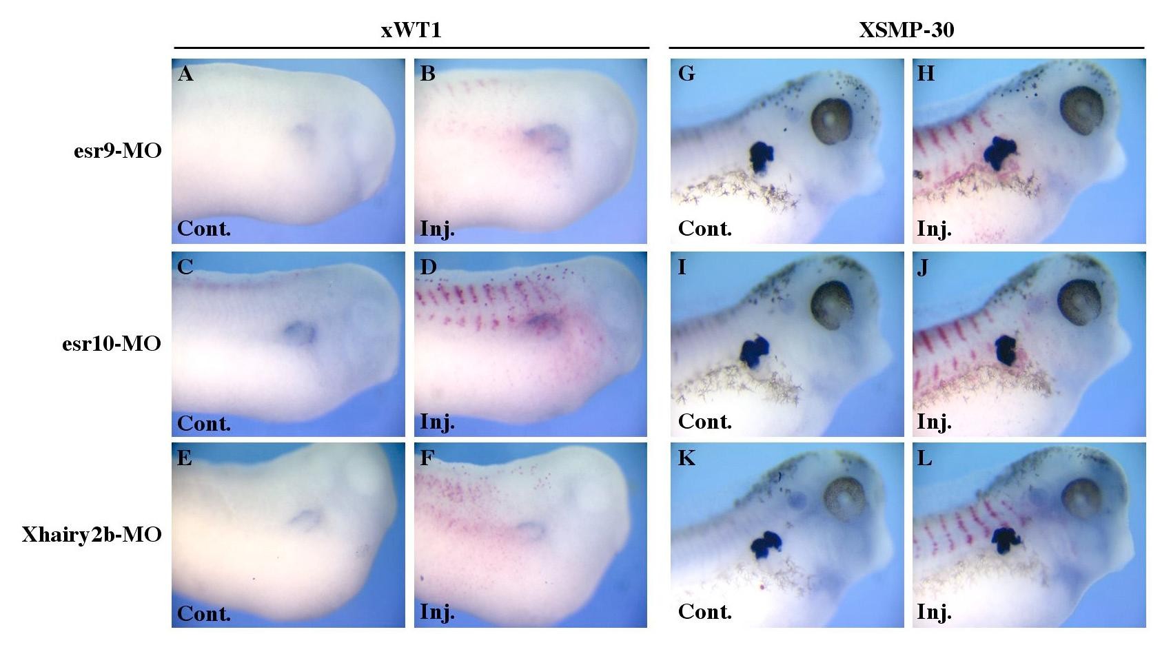 Fig. S2. Injection of esr9, esr10 and Xhairy2b MO does not inhibit xWT1 and XSMP-30 expression. (A-L) Whole-mount in situ hybridization of embryos injected with 15 ng of the indicated MOs together with β-galactosidase mRNA analysed at late tailbud/early tadpole stage with a xWT1 or XSMP-30 probe. Control and injected sides are shown. The injected area is revealed by X-gal staining. Unaffected: 75%, n=38; 77%, n=35; 63%, n=27; for esr9, esr10 and Xhairy2b MOs on xWT1; 68%, n=44; 78%, n=50; 75%, n=24; for esr9, esr10 and Xhairy2b MOs on XSMP-30.