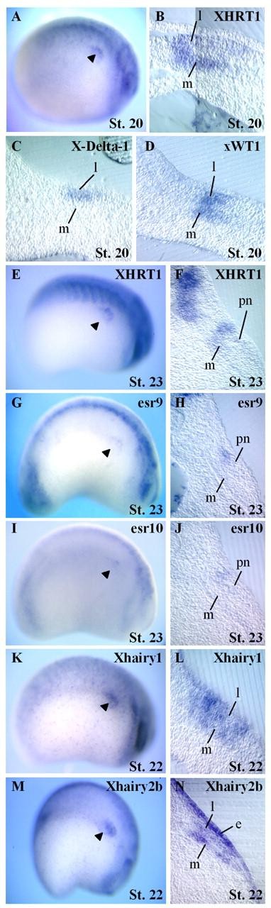Fig. 1. Whole-mount in situ analysis of XHRT1, esr9, esr10, Xhairy1 and Xhairy2b expression in comparison with X-Delta-1 and xWT1 in the pronephros region (arrowheads) of early tailbud stage embryos. Nieuwkoop-Faber stages are indicated (Nieuwkoop and Faber, 1967). (A-D) Comparison of the expression of XHRT1, X-Delta-1 and xWT1 in stage 20 embryos. (A) Whole embryo, lateral view, anterior right. (B-D) Transversal sections. XHRT1 expression coincides with that of xWT1 around the pronephros anlagen and surrounds that of X-Delta-1. (E-N) Comparison of the expression of XHRT1, esr9, esr10, Xhairy1 and Xhairy2b in stage 22-23 embryos. (E,G,I,K,M) Whole embryos, lateral views, anterior right. (F,H,J,L,N) Transversal sections. Note that esr9 and esr10 are co-expressed with XHRT1 around the dorsal border of the pronephros anlagen, and that Xhairy1 and Xhairy2b expression is detected in both mesodermal layers and in the ectoderm. e, ectoderm; pn, pronephros; l, lateral intermediate mesodermal layer; m, medial intermediate mesodermal layer.