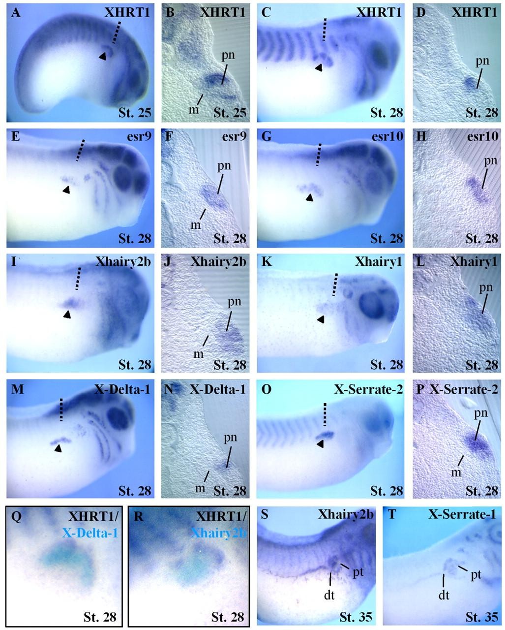 Fig. 2. Whole-mount in situ analysis of XHRT1, esr9, esr10, Xhairy1 and Xhairy2b in comparison with X-Delta-1 and X-Serrate-2 in the pronephros region (arrowheads) of late tailbud to tadpole stage embryos. Nieuwkoop-Faber stages are indicated. (A) At stage 25, XHRT1 is expressed in the most dorsoanterior portion of the pronephros anlagen. (B) Transversal section of the embryo shown in A at the level indicated. (C-P) Expression of XHRT1, esr9, esr10, Xhairy1, Xhairy2b, X-Delta-1 and X-Serrate-2 in stage 28 embryos. (A,C,E,G,I,K,M,O) Whole embryos, lateral views; (B,D,F,H,J,L,N,P) transversal sections of the corresponding embryos at the level indicated. Note that esr9 and esr10 staining appears slightly ventral compared with XHRT1. While X-Delta-1 expression is restricted to a band just below XHRT1, Serrate2 expression is broader. (Q,R) Double labeling of XHRT1 and X-Delta-1 or Xhairy2b. (S,T) At stage 35, Xhairy2b is co-expressed with X-Serrate-1 in the proximal and distal tubules. dt, distal tubules; pn, pronephros; pt, proximal tubules; m, medial intermediate mesodermal layer.