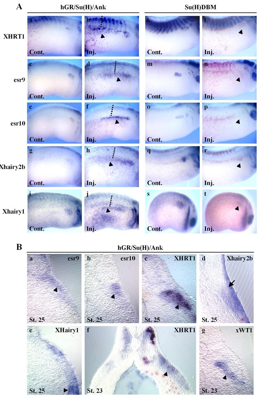 Fig. 3. XHRT1, esr9, esr10, Xhairy1 and Xhairy2b are responsive to Notch signaling in the pronephric mesoderm (arrowheads). Whole-mount in situ analysis of stage 23-30 embryos injected with hGR/Su(H)/Ank or Su(H)DBM mRNA. The inducible construct was activated at stage 18. (A, parts a-t) Control and injected sides of embryos, anterior right. Note the posterior expansion of the expression of the different bHLH-O genes on the injected side of hGR/Su(H)/Ank-injected embryos (arrowheads). Note the inhibition of their expression in Su(H)DBM-injected embryos (arrowheads). Except in d,f,h and j, the injected side is revealed by β-gal staining (red). (B, parts a-e) Transversal sections of the embryos shown in b,d,f,h,j at the level indicated. Note that the strongest esr9, esr10 and XHRT1 ectopic staining is detected in the lateral part of the intermediate mesoderm, while Xhairy1 and Xhairy2b expression is found in both layers (arrowheads). Xhairy2b is also strongly activated in the ectoderm (arrow). (B, part f) Transversal sections in stage 23 embryos in the posterior portion of the pronephros showing that XHRT1 ectopic expression in response to activation of Notch is already detected at that stage in both layers. (B, part g) Transversal section in the posterior portion of the pronephros of stage 23 embryos stained with xWT1. Ectopic staining of xWT1 is restricted to the medial layer.