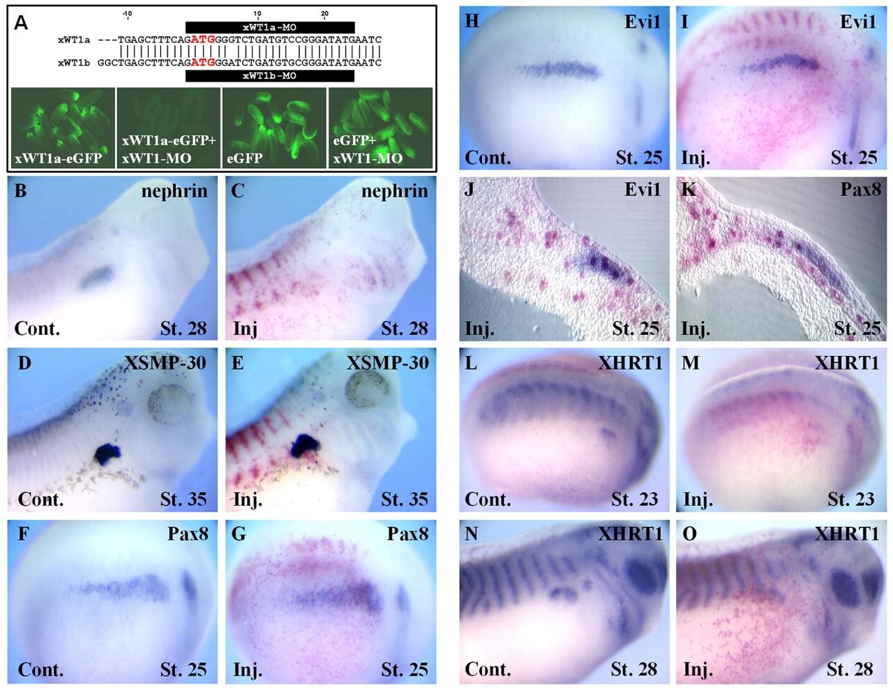 Fig. 4. XHRT1 early expression in the developing glomus is affected by translational inhibition of xWT1. (A) Design of the xWT1 MOs that target both pseudoalleles. (Bottom) In vivo translation of 500 pg of xWT1-eGFP is specifically inhibited by 15 ng of xWT1 MOs. (B-I) Control and injected sides of xWT1-depleted embryos stained with the indicated probes. xWT1 MOs abolished the expression of nephrin but had no effect on XSMP-30, Pax8 and Evi1. (J,K) Transversal sections of Evi1- and Pax8-stained xWT1-depleted embryos. Expression of both markers is unaffected by xWT1 knockdown. (L-O) Control and injected sides of xWT1-depleted embryos stained with XHRT1. Note that xWT1 knockdown decreases early but not late XHRT1 pronephric expression.