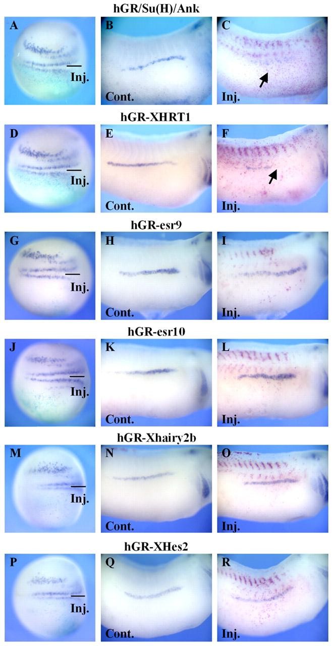 Fig. 5. XHRT1, but not esr9, esr10 or Xhairy2b inhibits pronephric distal tubule and duct formation. (A-R) Whole-mount in situ hybridization of embryos injected with 500 pg of mRNA encoding the indicated inducible constructs together with β-galactosidase mRNA analysed at stage 16 for N-tubulin (+Dex, stage 12; A,D,G,J,M,P) or stage 28 for Evi1 expression (+Dex, stage 18; B,C,E,F,H,I,K,L,N,O,Q,R). Embryos at neurula stage are viewed from the dorsal side, injected side downwards. Lateral view of control and injected sides of stage 28 embryos are shown. (A-C) Embryos injected with hGR/Su(H)/Ank mRNA showed an inhibition of N-tubulin and Evi1 expression (C, arrow). (D-R) Although overexpression of all bHLH-O genes inhibited N-tubulin in the neural plate, only XHRT1 overexpression inhibited Evi1 expression (F, arrow) in the pronephros. Lines in A,D,G,J,M,P indicate the injected and uninjected sides.