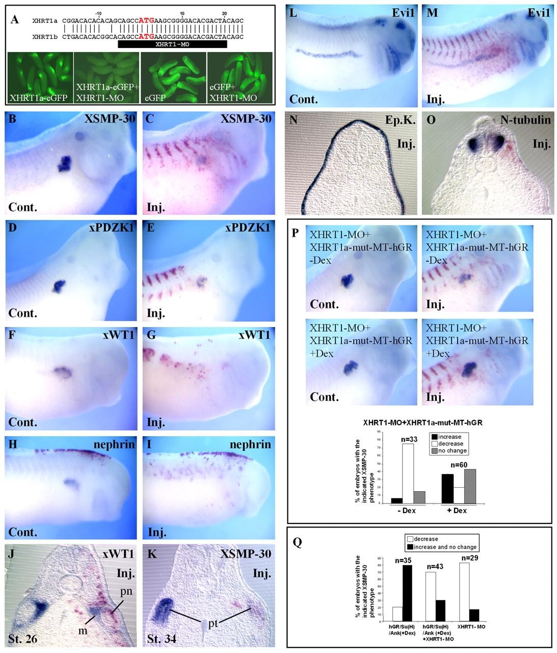 Fig. 8. Antisense morpholinos against XHRT1 reduces the expression of glomus and proximal tubule markers. (A) Design of the XHRT1-MO that targets both pseudoalleles. (Bottom) In vivo translation of XHRT1a-eGFP is specifically inhibited by XHRT1-MOs. Embryos were injected with 500 pg of XHRT1-eGFP or eGFP mRNA, alone or in combination with 15 ng of the XHRT1-MO, as indicated. (B-O) Embryos injected with 15 ng XHRT1-MO and β-galactosidase mRNA analysed with the indicated markers. (B-I) Control and injected sides of XHRT1-MO-injected embryos with decreased XSMP-30, xPDZK1, xWT1 and nephrin expression. (J,K) Transversal sections of XHRT1-MO-injected embryos. (L,M) XHRT1 knockdown has no effect on Evi1 expression. (N,O) Transversal sections of XHRT1-MO-injected embryos. Ep. keratin and N-tubulin expression is unaffected by XHRT1 knockdown. (P) Co-injection of the XHRT1-MO with 500 pg of XHRT1a-mut-MT-hGR mRNA rescues XSMP-30 expression in stage 22 dexamethasone-treated XHRT1-MO-injected embryos. Changes in the expression of XSMP-30 were scored and classified as in Fig. 6A. (Q) Co-injection of 15 ng XHRT1-MO inhibits the effect of overexpression of hGR/Su(H)/Ank (500 pg) on XSMP-30 expression. Injected embryos were dexamethasone treated at stage 22. Changes in the expression of XSMP-30 were classified into two groups (no change or increase, decrease). n, number of embryos analysed; m, medial intermediate mesodermal layer; pn, pronephros; pt, pronephric tubules.