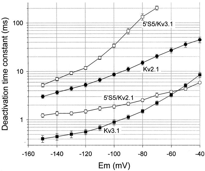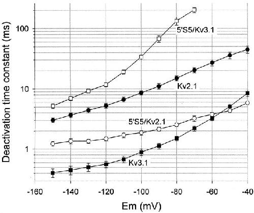 Figure 2. Voltage dependence of deactivation rate. Deactivation time constants were obtained by fitting the tail currents to monoexponential decay functions and were plotted semilogarithmically versus test potential: Kv2.1 ( filled circles), 5′S5/Kv2.1 (open circles), Kv3.1 ( filled squares), or 5′S5/Kv3.1 (open squares). The first 0.3 ms of the tail current was ignored during curve fitting to avoid limitations imposed by the clamp settling time. Each symbol represents average data from 5–10 membrane patches.