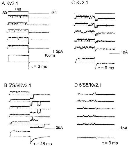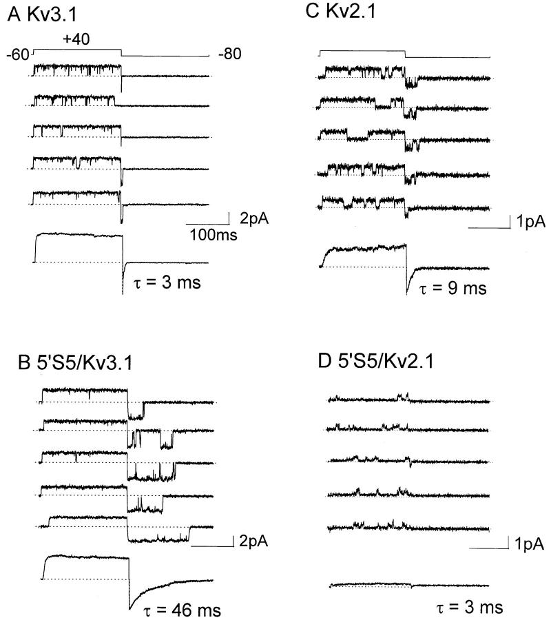 Figure 3. Effects of S5 mutations on single channel tail currents. Single-channel currents in Kv3.1 (A), 5′S5/Kv3.1 (B), Kv2.1 (C), and 5′S5/Kv2.1 (D) were recorded from cell-attached patches and the ensemble averages of 300–500 traces (except 5′S5, 128 traces). The patch membrane was pulsed to +40 mV for 200 ms and then returned to the holding potential of −80 mV. Pipette solution containing 60 mM NaCl and 60 mM KCl, and oocytes were bathed in a depolarizing isotonic KCl solution.