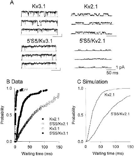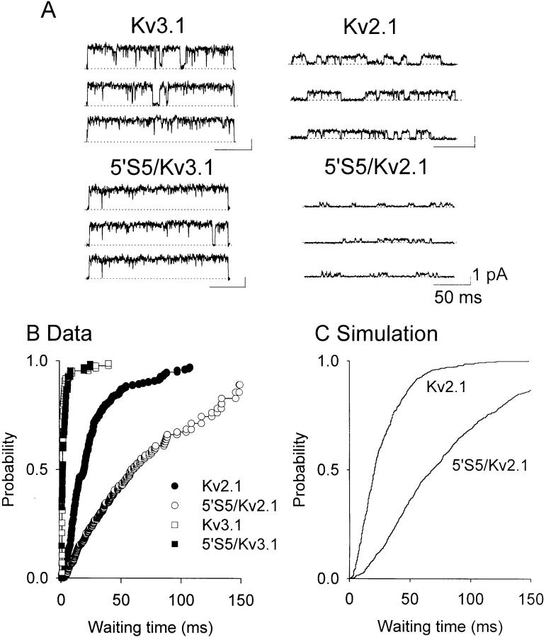 Figure 4. Cumulative first latency distributions. First latency distributions were obtained at +40 mV by patch-clamp single channel recording in the cell-attached mode. (A) Shows representative records in Kv3.1, 5′S5/Kv3.1, Kv2.1, and 5′S5/Kv2.1 channels. Pipette solution was normal Ringer containing 120 mM NaCl, and 2.5 mM KCl. Oocytes were bathed in a depolarizing isotonic KCl solution. (B) Shows the cumulative distribution of first latencies (from the representative experiments in A) at test potential +40 mV: Kv3.1 (open squares), 5′S5/Kv3.1 ( filled squares), Kv2.1 (f illed circles), and 5′S5/Kv2.1 (open circles), respectively. All data were obtained from single channel patches except 5′S5/Kv2.1 (3–8 channels/patch estimated from the maximum number of overlapping open channel events). These data were corrected (Aldrich et al., 1983) by taking the Nth root of the cumulative distribution (expressed as a survivor function, where N = 4, the estimated number of channels/patch in this experiment). As discussed in the text, because of the low Po of this mutant channel, the correction underestimates the slowing effect. (C) Compares the first latency distributions for Kv2.1 and 5′S5 obtained from the kinetic model described in Fig. 6.