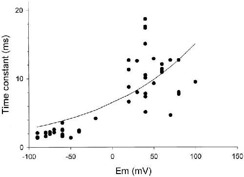Figure 5. Voltage dependence of single channel open time in Kv2.1. Mean open times were estimated from the time constant obtained by fitting a single exponential to the open time histogram. Each histogram was constructed from >100 events in a patch at a given test potential, and each plotted point gives the time constant obtained from a single patch. Data were obtained in cell-attached patches exposed extracellularly to high [K+]o solution (either 120 or 60 mM). The solid line was fit according to the equation: where z = equivalent valence, 0.22 e− and τ0 = 6.4 ms.
