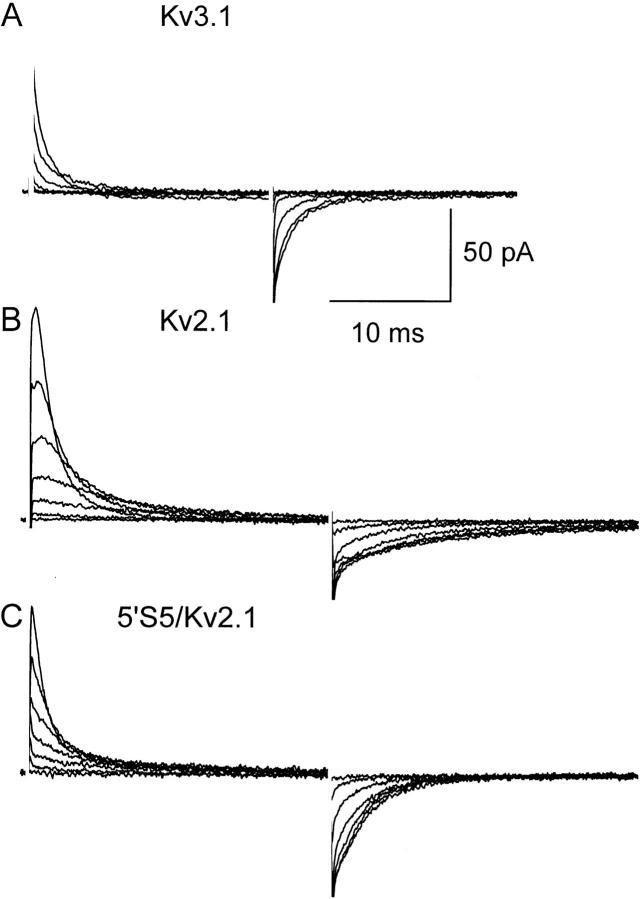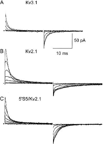 Figure 7. Gating currents measurements. Nonlinear capacitative currents in Kv3.1 (A), Kv2.1 (B), and 5′S5/Kv2.1 (C) were recorded in inside-out patches in the absence of permeant cations (NMG and TEA, respectively, were substituted in the internal and external solutions). The traces illustrate typical recordings obtained at test pulse potentials of −60 to +60 mV (20-mV increments) for Kv3.1, or −80 to +40 mV (20-mV increments) for Kv2.1 and 5′S5/Kv2.1 were applied from a holding potential of −90 mV. Linear components of the leak and capacitative currents were subtracted on-line using a P/−4 protocol (subtraction holding potential = −100 mV). No signal averaging was used. In A and B the first 0.3 ms of the ON and OFF transients are blanked because of imperfect subtraction.