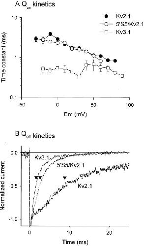 Figure 8. Mutations in 5′S5 selectively affect OFF gating current kinetics. A shows a semilogarithmic plot of the time constant of the major component of Ion decay in Kv2.1 ( filled circles), 5′S5/Kv2.1 (open squares), and Kv3.1 (open triangles) versus test potential. Time constants were obtained by fitting the decay phase of the on-gating current to a biexponential function and at each potential the time constant of the component that accounted for >90% of the decay was selected. Each symbol represents the average of 5–10 patches for each channel. B compares the time course of Ioff decay in peak-normalized Ioff records obtained from Kv3.1 (solid line), 5′S5/Kv2.1 (broken line), and Kv2.1 (dotted line) at a return potential of −90 mV after conditioning steps to produce near maximum activation (+60 mV for Kv3.1, 5′S5/Kv2.1 and +40 mV for Kv2.1). The arrowheads mark the time constants obtained by fitting the traces to monoexponential functions. The average time constants obtained from 5 to 10 membrane patches for each channel was 0.75 ± 0.15, 0.80 ± 0.51, and 8.10 ± 1.39 ms, respectively, in Kv3.1, 5′S5/Kv2.1, and Kv2.1.