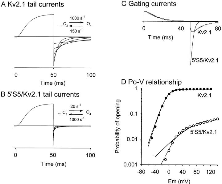 Figure 6. Numeric simulation of macroscopic currents in Kv2.1 and 5′S5/Kv2.1 using a sequential model. The effect of the mutation was assumed to be a destabilization of the open state caused by a sevenfold acceleration of the first closing step, O4→ C3, and a 50-fold slowing of the last opening step, C3→ O4. A and B show simulated tail currents, comparable to the actual records illustrated in Fig. 1. C and D show the predicted gating currents and Po-V relationships for the two channels. In D the smooth curves represent fits to single Boltzmann distributions with midpoint potentials (and slope factors) of −6 (11) and 68 (31.5) mV, respectively in Kv2.1 and 5′S5/Kv2.1. As indicated by the broken lines a better fit of the 5′S5/Kv2.1 data was obtained by using the sum of two Boltzmann distributions.