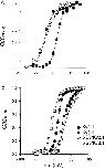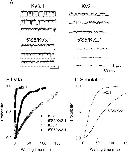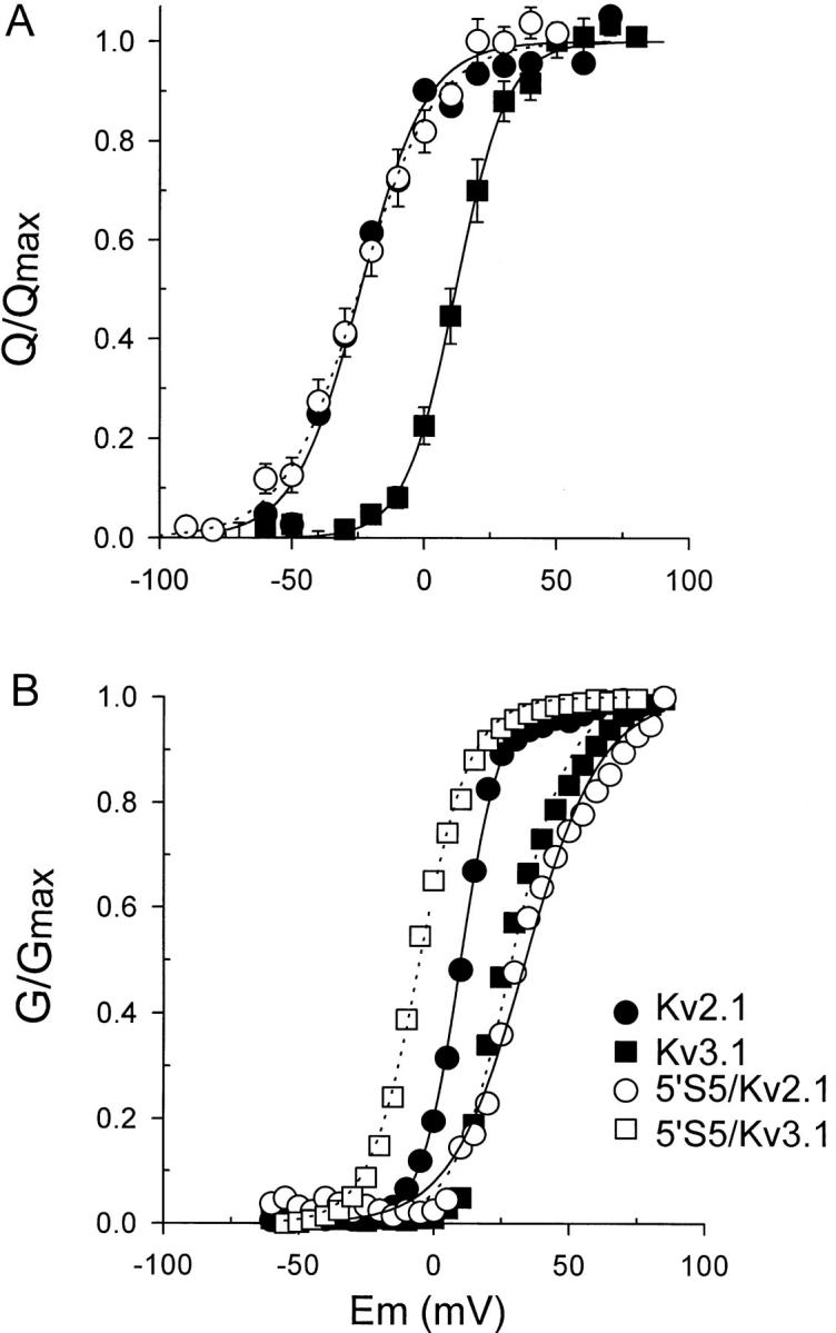 Figure 9. Voltage dependence of steady-state activation. Gating charge (A) was obtained from the time integral of Ion and was normalized to the maximal gating charge (Q max). Normalized charge was plotted versus test potential (Q-V) for Kv2.1 ( filled circles), 5′S5/Kv2.1 (open circles), and Kv3.1 ( filled squares). The conductance-voltage (G-V) relationship (B) was obtained by normalizing ionic conductances at each test potential by the maximal conductance. Normalized conductance was plotted for 5′S5/Kv3.1 (open squares), Kv2.1 ( filled circles), Kv3.1 ( filled squares), and 5′S5/Kv2.1 (open circles). Both Q-V and G-V data were fit to single Boltzmann functions (smooth curves). Data were pooled from >5 experiments (patches or oocytes, respectively, in A and B). For Kv2.1 the midpoint (V0.5) potentials were 10 and −25 mV, respectively for the G-V and Q-V curves, whereas V0.5 values for Kv3.1 were 20 and 0.9 mV. The midpoint of the Q-V curve for the 5′S5/Kv2.1 chimera was nearly identical to that of Kv2.1 (V0.5 = −22 mV), but the G-V curve (B; V0.5 = 22 mV) was shifted toward that of Kv3.1. The valence z for the gating charge (obtained from the slope of the Q-V curve) was the same in both Kv2.1 and the 5′S5/Kv2.1 chimera.