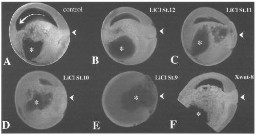 lithium at gastrula stages 12 (B), 11 (C), 10 (D), and 9 (E) or injected with pCSKA-Xwnt-8 m the dorsal marginal zone at the 4-ceU stage