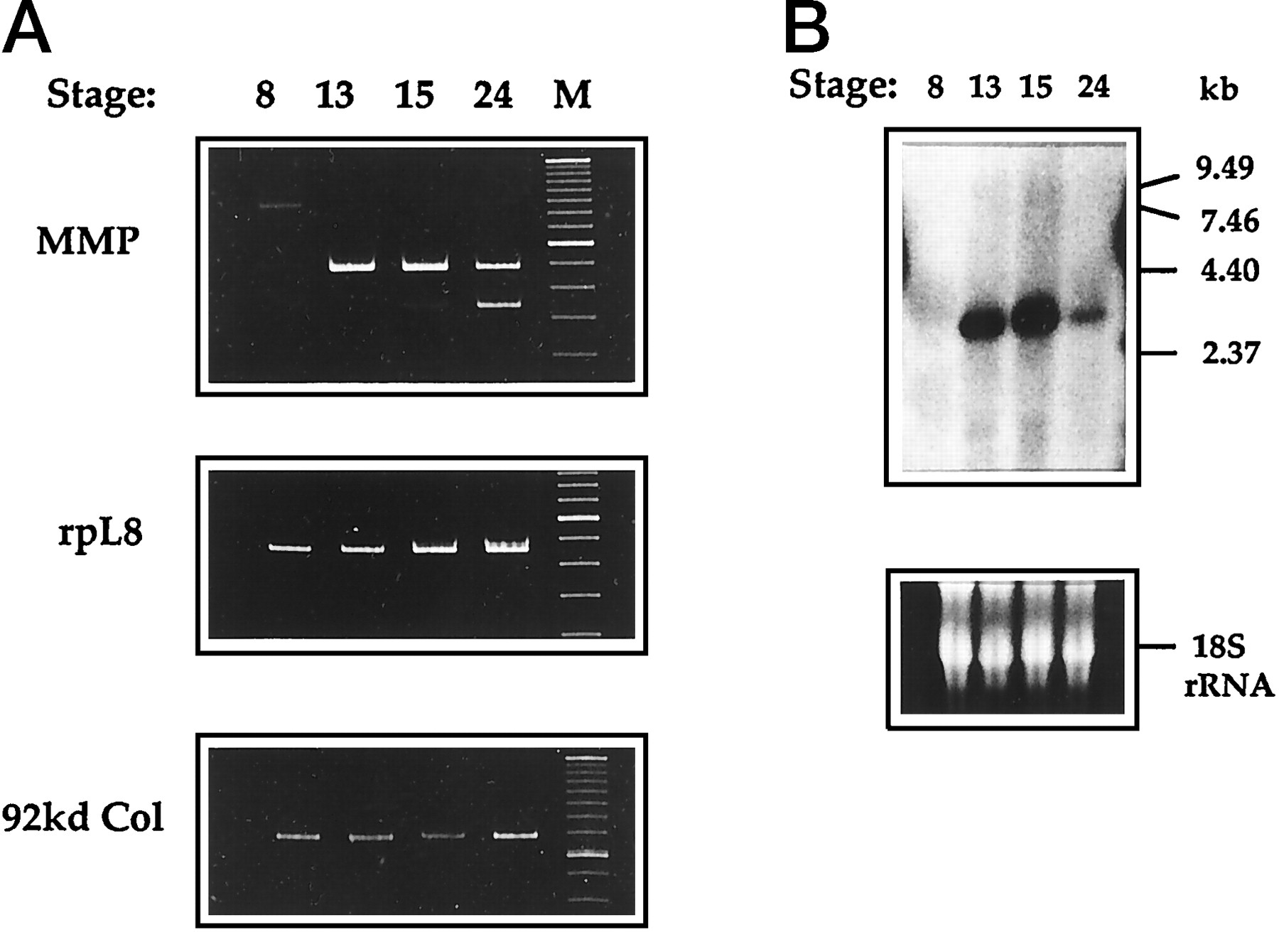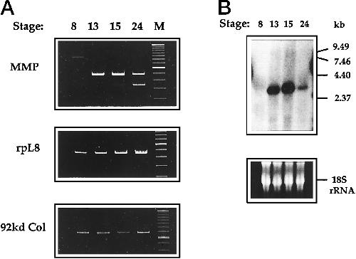 Cloning and developmental expression ofXenopus MMPs. A, top, RT-PCR with universal MMP primers using total RNA (0.5 μg) of blastula (stage 8), gastrula (stage 13), neurula (stage 15), and pretailbud (stage 24)Xenopus embryos. PCR of 40 cycles. Middle, RT-PCR with specific primers for the Xenopus ribosomal protein rpL8. PCR of 27 cycles. Bottom, RT-PCR with specific primers for the Xenopus 92-kDa type IV collagenase. PCR of 36 cycles. Lane M shows DNA size markers (100-bp ladder from Life Technologies, Inc). B, in Northern blotting, total RNA (10 μg) of blastula (8), gastrula (13), neurula (15), and pretailbud (24) Xenopus embryos was analyzed for the novelXenopus XMMP gene expression (a 3.0-kilobase pair mRNA).Numbers on the left show RNA size markers (Life Technologies, Inc.). As a control for RNA loading and transfer, the bottom panel shows 18 S ribosomal RNA on the same Northern filter visualized by EtBr staining and UV light.