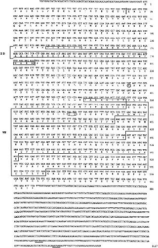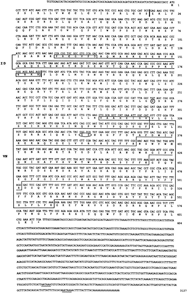 Xenopus XMMP. In the cDNA-derived amino acid sequence of 604 residues of Xenopus XMMP, the first bar indicates a putative signal peptide cleavage site, and the second bar shows propeptide cleavage site.Boxed sequences mark two conserved MMP sequences that were used in primer design to clone Xenopus MMPs (see Fig. 1), and an RRKR motif, a putative cleavage site for intracellular furin-proteinases. The underlined sequence is a 37-residue-long ID. The circled GS residues refer to a missing hinge region in XMMP (see Fig. 5). The large box is a domain of four tandem repeats of a motif similar to that encoded by vitronectin exon 5 (see Fig. 4). The nine Cys residues are shown inbold, and a “signature” Cys273 iscircled. Two polyadenylation signals areunderlined.