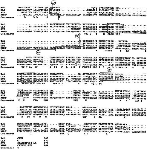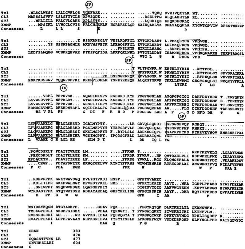 Comparison of the frog MMPs. A sequence alignment of Tc1, Rana bullfrog tailbud collagenase (34), CL3, Xenopus collagenase-3 (GenBank™ number L49412), ST3,Xenopus stromelysin-3 (28), and XMMP. SP andPP show putative signal peptide and propeptide cleavage sites, respectively. The underlined sequence is a 37-residue ID of XMMP (residues 143–180). Boxed sequences are two conserved MMP domains and a proline-rich hinge region or linker peptide (LP). A signature Cys273 of XMMP iscircled. Consensus shows amino acids that are identical between three or all four frog MMPs.