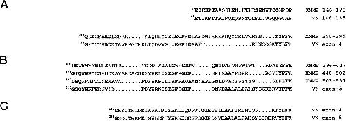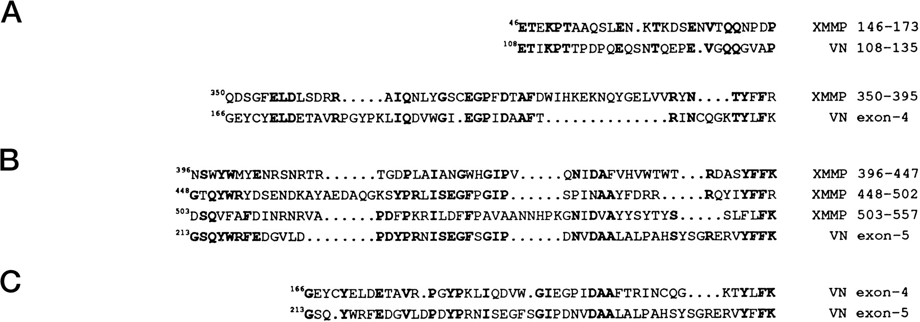 Evolutionary conservation of XMMP and vitronectin. A, alignment of ID sequence with a rat vitronectin sequence between residues 108–135. Identical residues arebold. B, four tandem XMMP repeats (see Fig. 2) are aligned with sequences encoded by rat vitronectin exons 4 and 5.Bold residues are identical between XMMP and vitronectin.C, rat vitronectin exons 4 and 5 encode sequences with 30% (16 of 53) identical amino acids shown in bold.