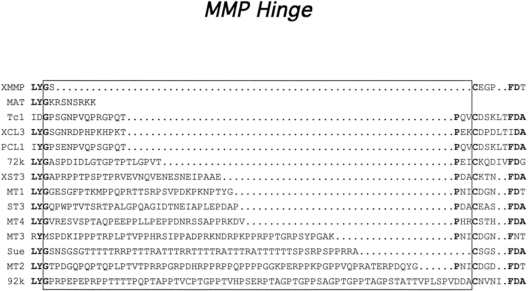 MMP hinge. All MMPs, with the exception of XMMP, have a proline-rich hinge region (linker peptide) between the catalytic domain and COOH-terminal hemopexin/vitronectin-like domain. Representative MMP hinge sequences shown are flanked by consensus residues in bold. The sequences are from Tc1, bullfrog Rana tadpole collagenase (34); XCL3,Xenopus collagenase-3 (GenBank⢠number L49412);PCL1, porcine interstitial collagenase (GenBank⢠numberX54724); XST3, Xenopus stromelysin-3 (28); andSue, sea urching hatching enzyme (33). The other sequences are from human MAT, matrilysin (42), which lacks the hinge region and COOH-terminal domain; 72k, 72-kDa type IV collagenase (43); ST3, stromelysin-3 (44); MT1,MT2, MT3, and MT4, four different MT-MMPs (17-21); and 92k, 92-kDa type IV collagenase (45).