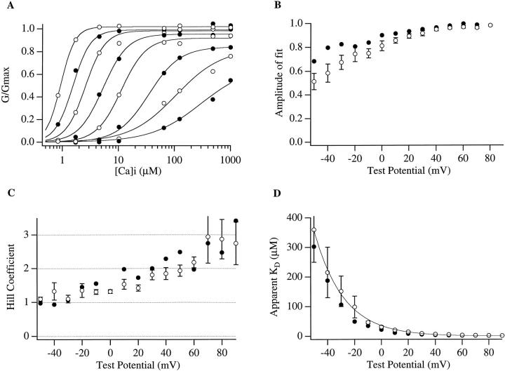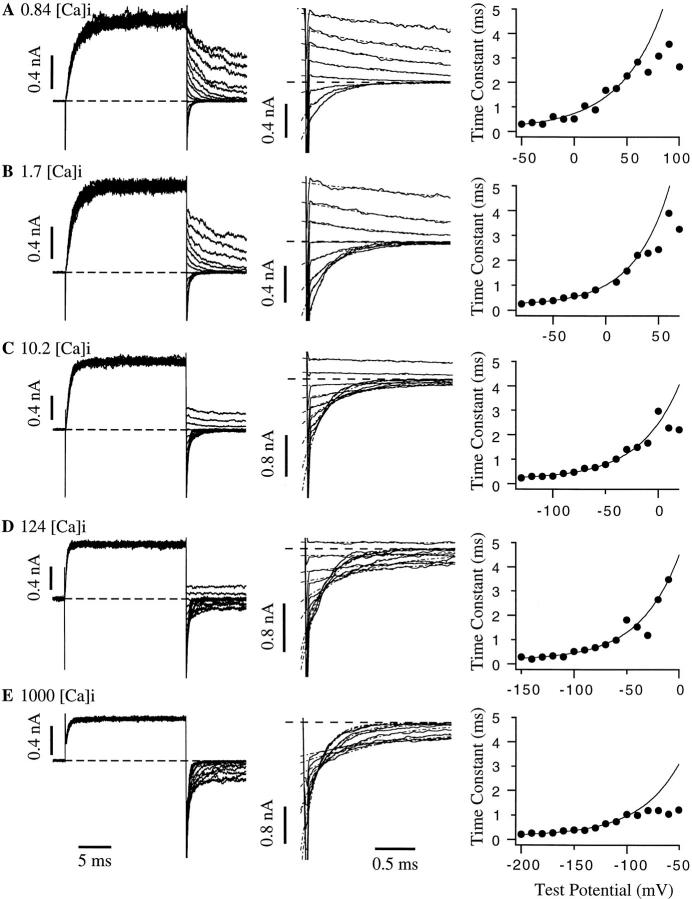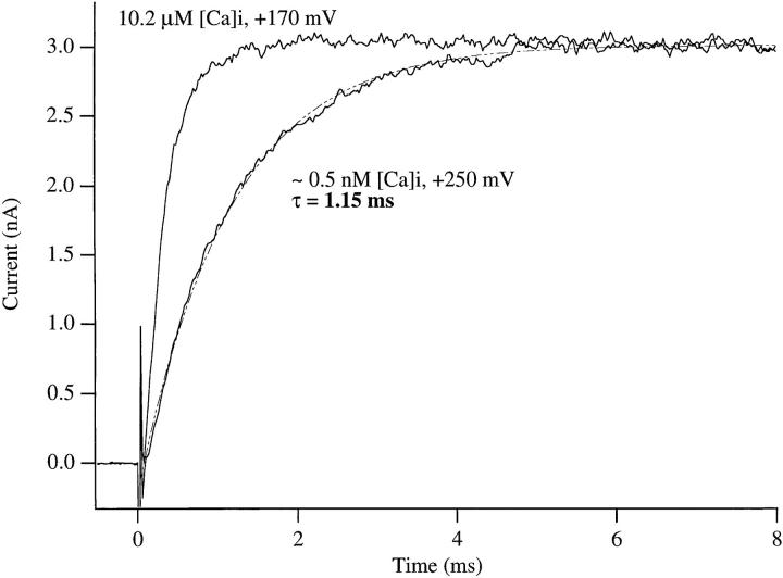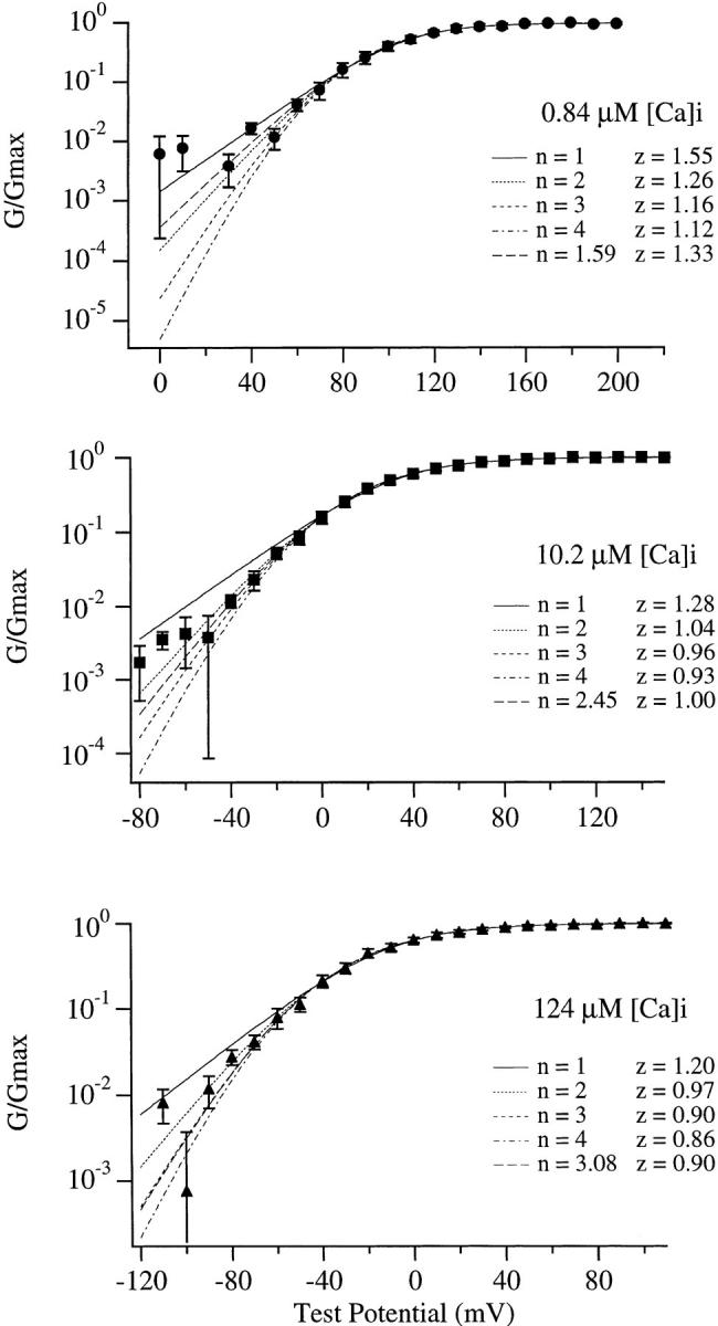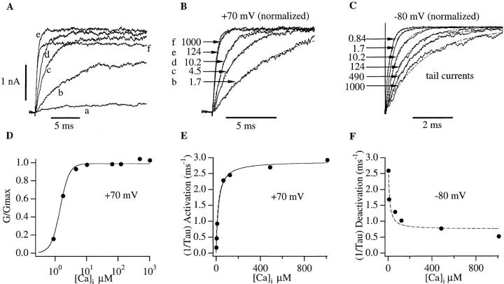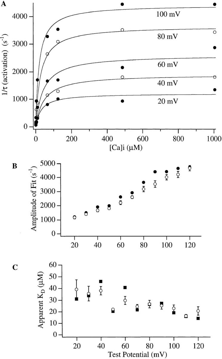 The kinetic and steady-state properties of macroscopic mslo Ca-activated K+ currents were studied in excised patches from Xenopus oocytes. In response to voltage steps, the timecourse of both activation and deactivation, but for a brief delay in activation, could be approximated by a single exponential function over a wide range of voltages and internal Ca2+ concentrations ([Ca]i). Activation rates increased with voltage and with [Ca]i, and approached saturation at high [Ca]i. Deactivation rates generally decreased with [Ca]i and voltage, and approached saturation at high [Ca]i. Plots of the macroscopic conductance as a function of voltage (G-V) and the time constant of activation and deactivation shifted leftward along the voltage axis with increasing [Ca]i. G-V relations could be approximated by a Boltzmann function with an equivalent gating charge which ranged between 1.1 and 1.8 e as [Ca]i varied between 0.84 and 1,000 microM. Hill analysis indicates that at least three Ca2+ binding sites can contribute to channel activation. Three lines of evidence indicate that there is at least one voltage-dependent unimolecular conformational change associated with mslo gating that is separate from Ca2+ binding. (a) The position of the mslo G-V relation does not vary logarithmically with [Ca]i. (b) The macroscopic rate constant of activation approaches saturation at high [Ca]i but remains voltage dependent. (c) With strong depolarizations mslo currents can be nearly maximally activated without binding Ca2+. These results can be understood in terms of a channel which must undergo a central voltage-dependent rate limiting conformational change in order to move from closed to open, with rapid Ca2+ binding to both open and closed states modulating this central step.