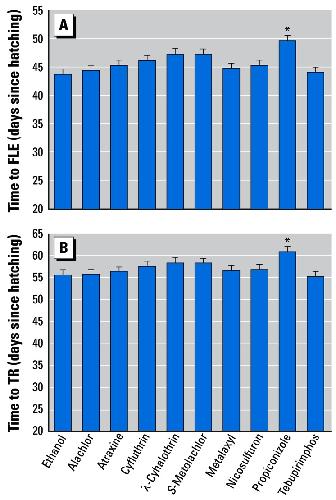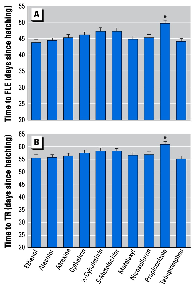 Figure 1. Effect of single pesticides (0.1 ppb each) on time to initiate metamorphosis (FLE; A) and time to complete metamorphosis (TR; B). Error bars show SEM.*Statistically significant groups (ANOVA, p < 0.05).