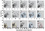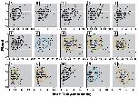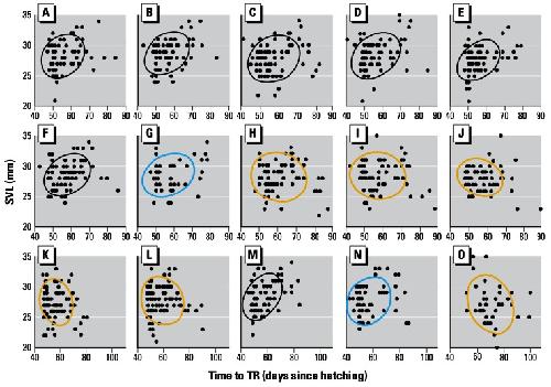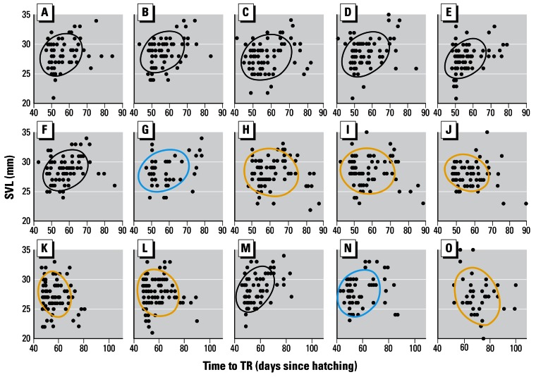 Figure 5. Correlational analysis of time to complete TR and SVL. Results are shown for single pesticides (0.1 ppb) in A–J and for mixtures (K–O). For the x-axis, the scales for A–J are identical, but note the difference in scale for the mixtures as a result of the delay in metamorphosis in the animals treated with the nine-compound mixture (O). Results are shown for ethanol (A), alachlor (B), cyfluthrin (C), nicosulfuron (D), tebupirimphos (E), S-metolachlor (F), metalaxyl (G), propiconizole (H), λ-cyhalothrin (I), atrazine (J), 0.1 ppb atrazine + S-metolachlor (K), 10 ppb atrazine + S-metolachlor (L), 0.1 ppb Bicep II Magnum (M), 10 ppb Bicep II Magnum (N), and the nine-compound mixture (O). Ellipses show Gaussian bivariate confidence limits. Ellipses are color-coded: black, a positive and significant correlation; blue, a positive but nonsignificant correlation; yellow, a negative but nonsignificant correlation. Significance (p ≤ 0.05) was determined by Bonferroni probabilities and based on Spearmen rank order correlation coefficients. Sample size (as reported in Table 1) cannot be determined from the number of data points due to overlapping data.