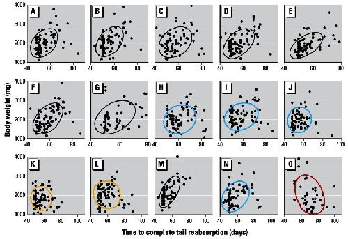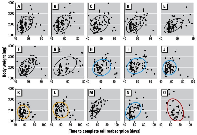 Figure 6. Correlational analysis of time to complete TR and BW. Results are shown for single pesticides (0.1 ppb) in A–J and for mixtures (K–O). For the x-axis, the scales for the top two rows are identical, but note the difference in scale for the mixtures as a result of the delay in metamorphosis in the animals treated with the nine-compound mixture (O). Results are shown for ethanol (A), alachlor (B), cyfluthrin (C), nicosulfuron (D), tebupirimphos (E), S-metolachlor (F), metalaxyl (G), propiconizole (H), λ-cyhalothrin (I), and atrazine (J), 0.1 ppb atrazine + S-metolachlor (K), 10 ppb atrazine + S-metolachlor (L), 0.1 ppb Bicep II Magnum (M), 10 ppb Bicep II Magnum (N), and the nine-compound mixture (O). Ellipses show Gaussian bivariate confidence limits. Ellipses are color-coded: black, a positive and significant correlation; blue, a positive but nonsignificant correlation; yellow, a negative but nonsignificant correlation; red, a negative and significant correlation. Significance (p ≤ 0.05) was determined by Bonferroni probabilities and based on Spearmen rank order correlation coefficients. Sample size (as reported in Table 2) cannot be determined from the number of data points because of overlapping data.