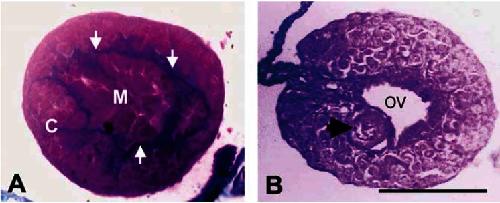 Figure 7. Histological transverse cross-section (8 μm) of presumptive male (A) and female (B) leopard frog (R. pipiens) at metamorphosis (Gosner stage 46). Gonads are not completely differentiated. Note the intact cortex (C) and medulla (M) separated by blue connective tissue (arrows in A). Also note medullary regression and ovarian vesicle (OV) but absence of significant oogenesis in the female (B). A single oocyte (arrow) is noted in the female. Scale bar = 125 μm.