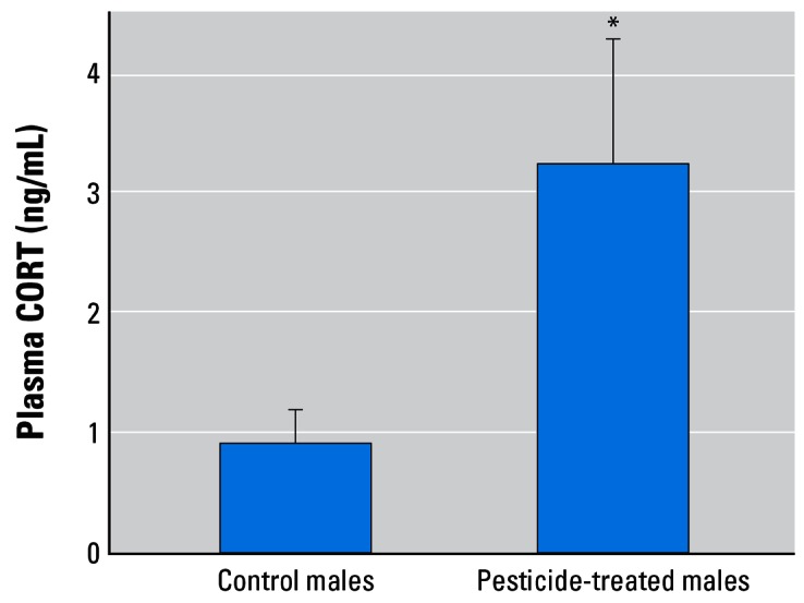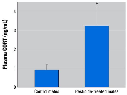 Figure 10. Effect of the pesticide mixture on plasma corticosterone levels in adult male African clawed frogs (X. laevis). Error bars show SEM.*Statistical significance (p < 0.05).