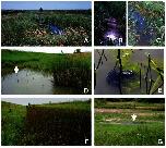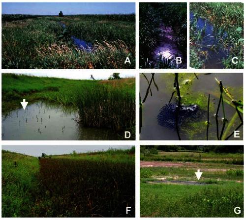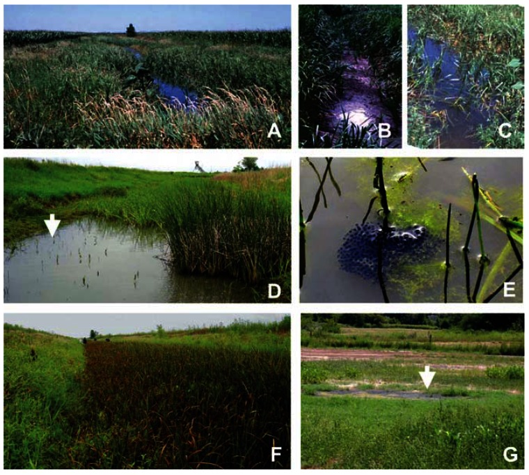 Figure 11. Field 413 (40°55.88 N, 97°22.38 W), York County, Nebraska (A–F). In 2001 frogs bred in the irrigation ditch (A) and were present by the thousands. Even at this time, the water level (and thus temperature and pesticide levels) fluctuated drastically from one day to the next: the photo in B was taken on 22 July 2001 and photos in A and C were taken on 23 July 2001. (B) All the water has evaporated and only the small pool (white glare) remains. In 2004 seven pairs of frogs bred at the same site when the irrigation ditch filled with rainwater and snowmelt (D; arrow indicates where frog clutches were found). (E) One of the seven clutches. (F) The fields around the irrigation ditch were not planted in 2003 or 2004, and the ditch dried up, resulting in 100% failure of the population at this site for the second year since initial collection. (G) A breeding pond (arrow) in Hitchcock County, Nebraska (40°08.433 N, 101°13.804 W) along the Republican River. All the tadpoles died of desiccation at this site, further illustrating the interaction between pesticides that slow development and delay metamorphosis and the impact of agriculture (and irrigation practices) on amphibian populations.