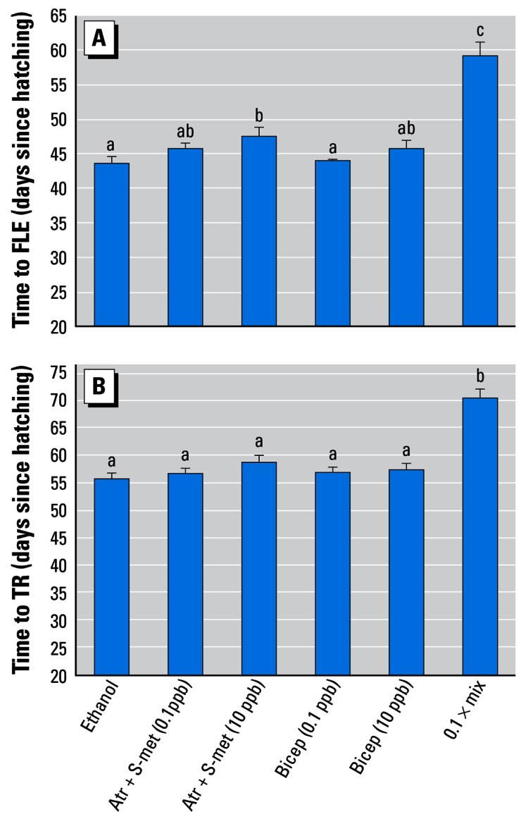 Figure 2. Effect of pesticide mixtures on time to initiate metamorphosis (FLE; A) and time to complete metamorphosis (TR; B). Abbreviations: Atr, atrazine; Bicep, Bicep II Magnum; S-Met, S-metolachlor; Mix, nine-chemical mixture (0.1 ppb each pesticide). Letters above bars indicate statistical groupings. Error bars show SEM.*Statistically significant groups (ANOVA, p < 0.05).