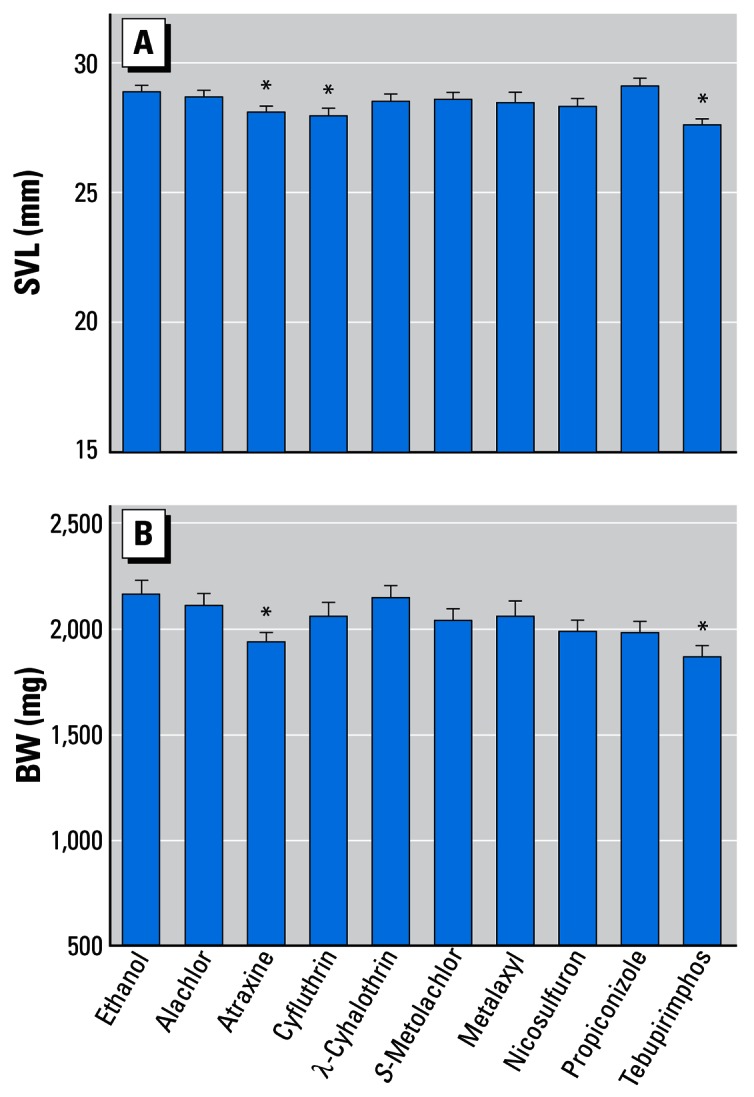 Figure 3. Effect of single pesticides (0.1 ppb each) on SVL (A) and BW (B). Error bars show SEM.*Statistically significant groups (ANOVA, p < 0.05).