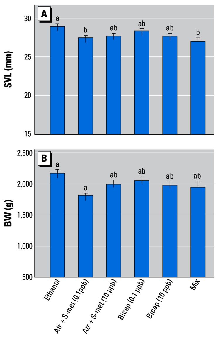 Figure 4. Effect of pesticide mixtures on SVL) (A) and BW(B). Abbreviations: Atr, atrazine; Bicep, Bicep II Magnum; S-met, S-metolachlor; Mix, nine-chemical mixture (0.1 ppb each pesticide). Letters above bars show statistical groupings. Error bars show SEM.