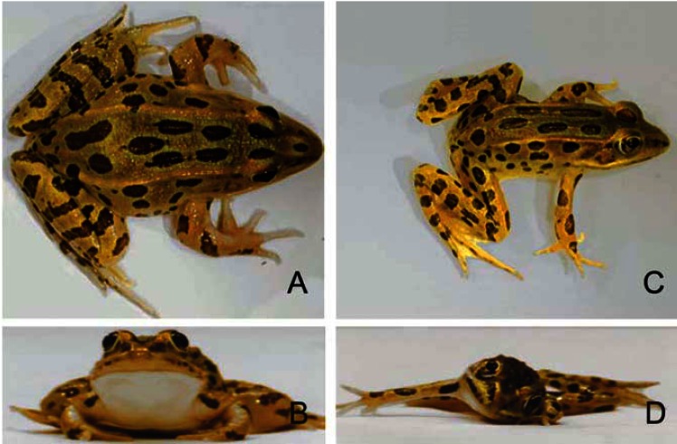 Figure 8. Dorsal (A,C) and frontal (B,D) view of newly metamorphosed (Gosner stage 46) control (A,B) R. pipiens and similar-aged animal exposed to the nine-pesticide mixture (C,D). Control animal is in good body condition as expected. The pesticide-treated animal is in poor body condition because of a generalized gram-negative bacterial infection. The pathogen was identified in control and treated frogs, but only pesticide-exposed animals show signs of disease: head tilt, unilateral extensor muscle rigidity, anisocoria, and intermittent recumbency due to a severe otitis interna and meningitis. This presentation is consistent with C. menigosepticum infection, a stress-induced disease of frogs.