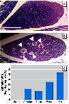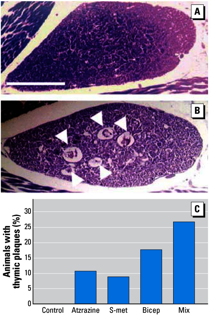 Figure 9. Representative transverse cross-section through the thymus of a control animal (A) and (B) an animal treated with the nine-compound pesticide mixture. (C) The frequency of animals with detectable damage to the thymus. No control animals showed damage to the thymus. Animals exposed to 0.1 ppb atrazine or to S-metolachlor (S-met) had damage as shown in B, with increasing frequencies of damage with exposure to Bicep II Magnum (atrazine + metolachlor, given to concentration of 0.1 ppb atrazine), and maximum damage with exposure to the pesticide mixture (Mix). Histological sections were 4 μm stained in Mallory’s trichrome stain. Scale bar = 0.5 mm for A and B.