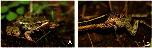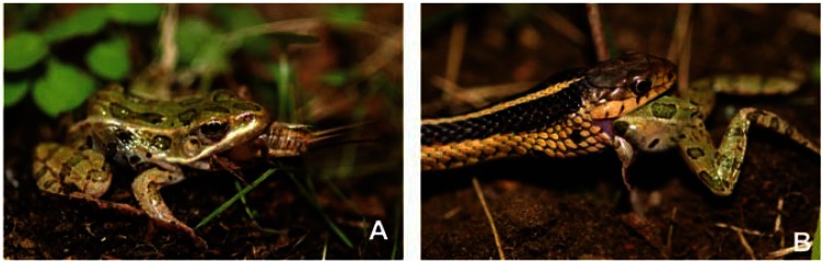 Figure 12. Demonstration of the effects of decreased size at metamorphosis on amphibians. (A) Newly metamorphosed leopard frog (R. pipiens) attempting to ingest a cricket that is too large (frog is 3.3 cm SVL; cricket is 2.1 cm long). (B) A 67-cm-long garter snake (Thamnophis sirtalis) feeding on a newly metamorphosed 3.2-cm-long leopard frog (R. pipiens). Frogs are gape-limited predators and less likely to find appropriate food when size at metamorphosis is reduced by pesticides. Similarly, garter snakes (like all snakes) are gape-limited predators, so smaller frogs are more vulnerable to snake predation.