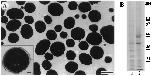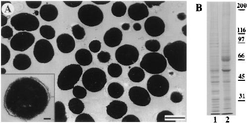 Figure 1 (A) Electron micrograph of a thin-sectioned pellet of purified melanosomes. The purified melanosome fractions are uncontaminated by other organelles. (Bar = 0.5 μm.) (Inset) A melanosome at higher magnification showing bilayer membrane encapsulating the electron-dense melanin core. (Bar = 0.1 μm.) (B) A Coomassie-stained polyacrylamide gel comparing melanophore extract (lane 1) with purified melanosomes (lane 2). The positions of the molecular weight markers are indicated to the right of lane 2.