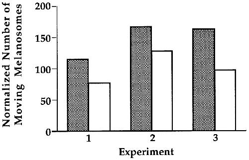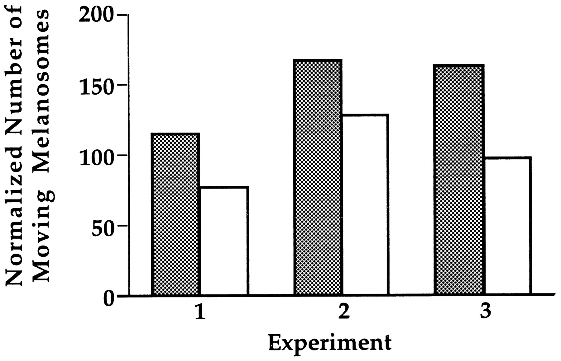 Figure 4 Comparison of the movement of crude (shaded bars) and Percoll-purified melanosomes (open bars). The samples were assayed on a continuous carpet of microtubules, and the total number of motile melanosomes per field was tallied over 10-min periods. At least three different samples were assayed per preparation. The results for each treatment were averaged, and both results were normalized for melanosome concentration using the OD550 of each sample. Results of three individual experiments are shown.