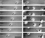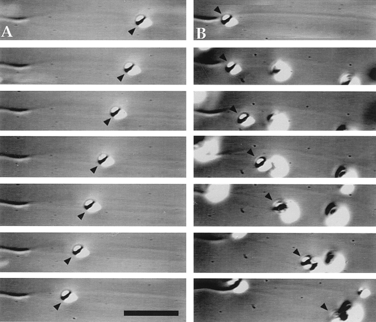 Figure 2 Bidirectional motility of a single melanosome along an axoneme-nucleated microtubule observed by video-enhanced DIC microscopy. Portions of a video sequence showing (A) minus end-directed motility and (B) plus end-directed motility of the same melanosome (arrowheads). The elapsed time between frames is 2 s. (Bar = 6 μm.)
