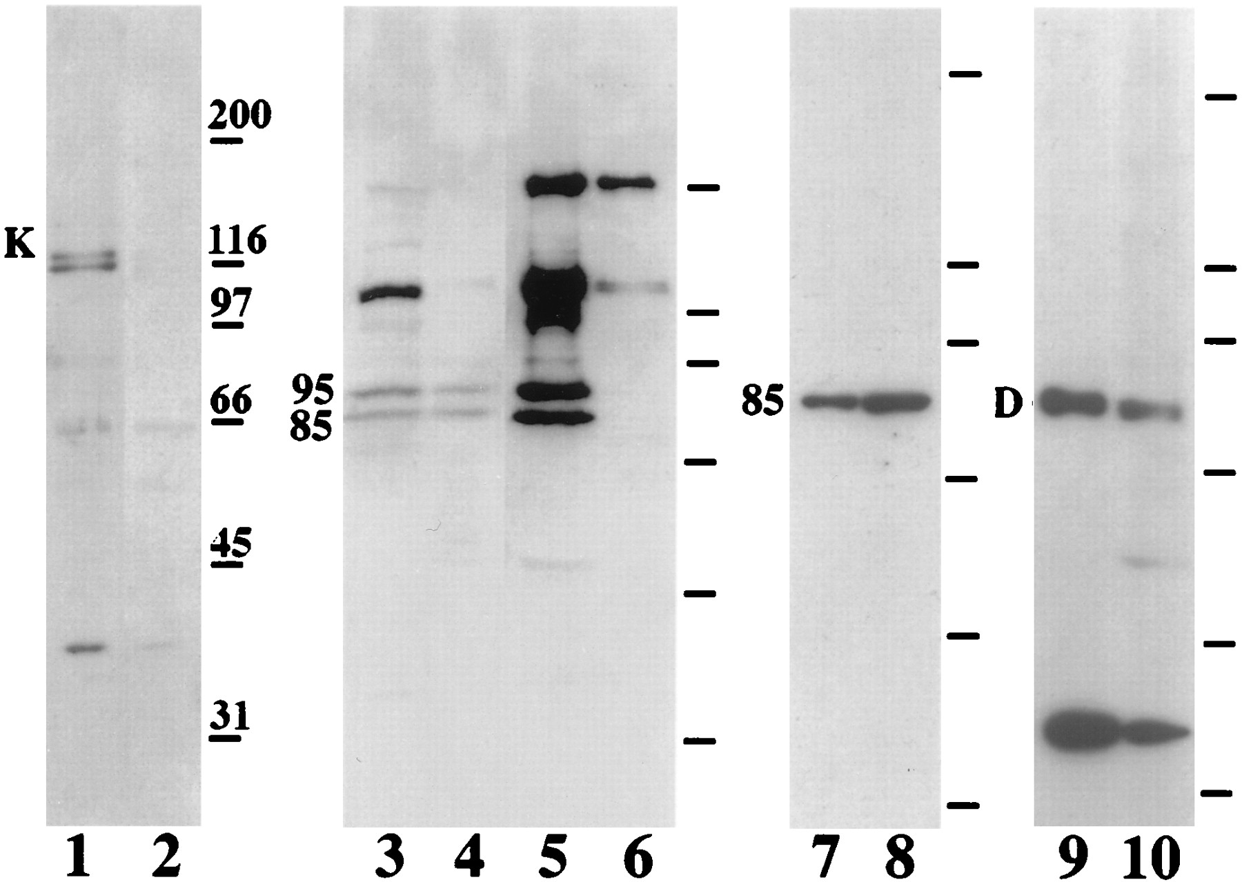 Figure 5 Microtubule motors in melanophores and on melanosomes. Lanes 1â10 show immunoblots probed with antibodies against motor proteins. Kinesin was probed with polyclonal HD-kin5 in cell extract (lane 1) and melanosomes (lane 2). Kinesin heavy chain is marked with âK.â Kinesin-related proteins were detected with the pan-kinesin antibody HIPYR in cell extract (lane 3), melanosomes (lane 4), and proteins that cosediment with microtubules in the presence of AMP-PNP (lane 5) or ATP (lane 6). The 85- and 95-kDa subunits of kinesin-II are indicated. Kinesin-II was probed with the monoclonal K2.4 in cell extract (lane 7) and melanosomes (lane 8). The position of the 85-kDa chain is indicated. Cytoplasmic dynein was detected with the monoclonal 74.1 against dynein intermediate chain in cell extract (lane 9) and melanosomes (lane 10). The position of the 83-kDa intermediate chain is indicated with âD.â The positions of the molecular weight standards are marked to the right of each blot.
