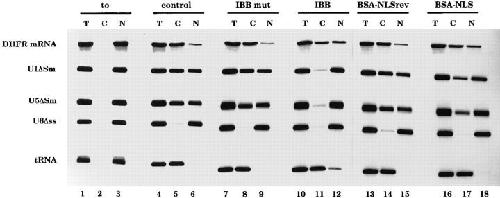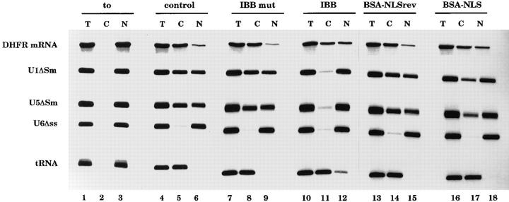 Figure 6. Inhibitors of basic NLS import differentially affect U snRNA and mRNA export. Xenopus leavis oocytes were injected into the cytoplasm with the inhibitors indicated above the lanes. As a control, oocytes were injected with PBS alone (lanes 1â6). After 1 h incubation a second microinjection was performed into the oocyte nuclei with a mixture of the following radioactively labeled RNAs: DHFR mRNA, U1ÎSm, U5ÎSm, U6Îss, and human initiator methionyl tRNA. U6Îss does not leave the nucleus and is an internal control for nuclear integrity. Synthesis of DHFR, U1ÎSm, and U5ÎSm RNAs was primed with the m7GpppG cap dinucleotide, whereas synthesis of U6Îss RNA was primed with γ-mGTP. In lanes 4â18 RNA was extracted 150 min after injection; in lanes 1â3, RNA was extracted immediately after injection. The concentration of the inhibitors in the injected samples was as indicated in Fig. 4.