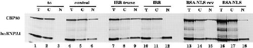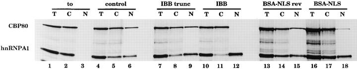 Figure 4. M9-mediated import is importin α independent. Xenopus laevis oocytes were injected into the cytoplasm with a mixture of labeled CBP80 and hnRNP A1 as indicated. In lanes 1–6, labeled proteins were diluted in PBS; in lanes 7–18 the labeled proteins were coinjected with the inhibitors indicated above the lanes. Bacterially expressed recombinant IBB (lanes 10–12) or truncated IBB (IBB trunc; lanes 7–9) were injected at a concentration of 20 mg/ml. The concentration of the BSA-NLS peptide conjugate (lanes 16–18) or of the BSA crosslinked to the reverse NLS peptide (BSA-NLSrev; lanes 13–15) was 20 mg/ml in the injection mixtures. Protein samples from total oocytes (T) or cytoplasmic (C) and nuclear (N) fractions were collected 5 h after injection in lanes 4–18 or immediately after injection in lanes 1–3. Proteins were analyzed as described in Fig. 1.