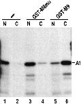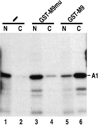 Figure 2. M9-mediated nuclear import is saturable. In vitro translated 35S-labeled hnRNP A1 (A1) was injected into Xenopus laevis oocyte cytoplasm either without competitor (lanes 1 and 2) or with bacterially expressed GST-M9 mutant fusion (A1 aa268-305, Gly 274 mutated to Ala; GST-M9mu; lanes 3 and 4) or GST-M9 fusion (A1 aa268-305; lanes 5 and 6). The concentration of recombinant proteins in the injected samples was 10 mg/ml, and the final concentration in the oocyte is 5–10% of this value. Transport was analyzed after 5 h incubation as described in Fig. 1.
