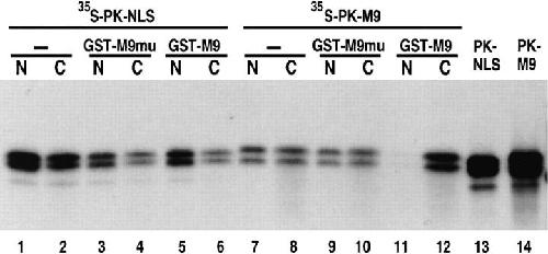 Figure 3. Saturation of the M9 import pathway does not interfere with NLS-mediated import. In vitro translated 35S-labeled PKNLS and PK-M9 (A1 aa268-305) were injected into the cytoplasm of Xenopus laevis oocytes either without competitor (lanes 1 and 2 and 7 and 8) or with bacterially expressed recombinant GST-M9 (lanes 5 and 6 and 11 and 12) or GST-M9mu (lanes 3 and 4 and 9 and 10). Lanes 13 and 14 show in vitro translated PK-NLS and PK-M9, respectively. The concentration of recombinant proteins in the injected samples was 10 mg/ml. Transport was analyzed 5 h after injection as described in Fig. 1.